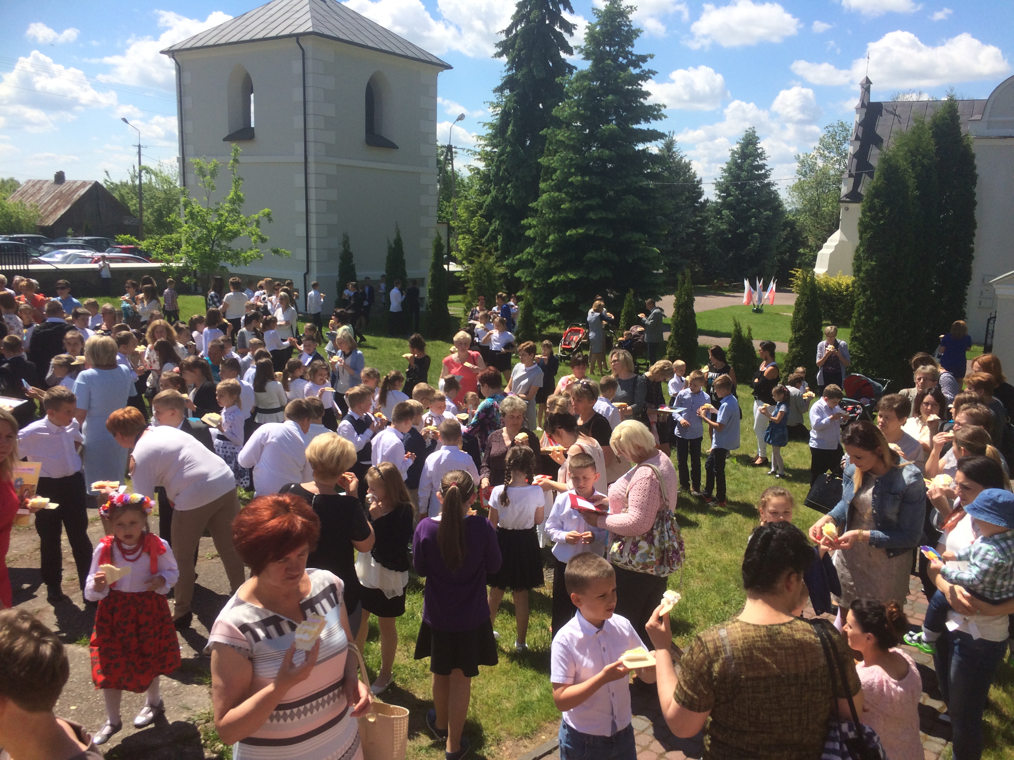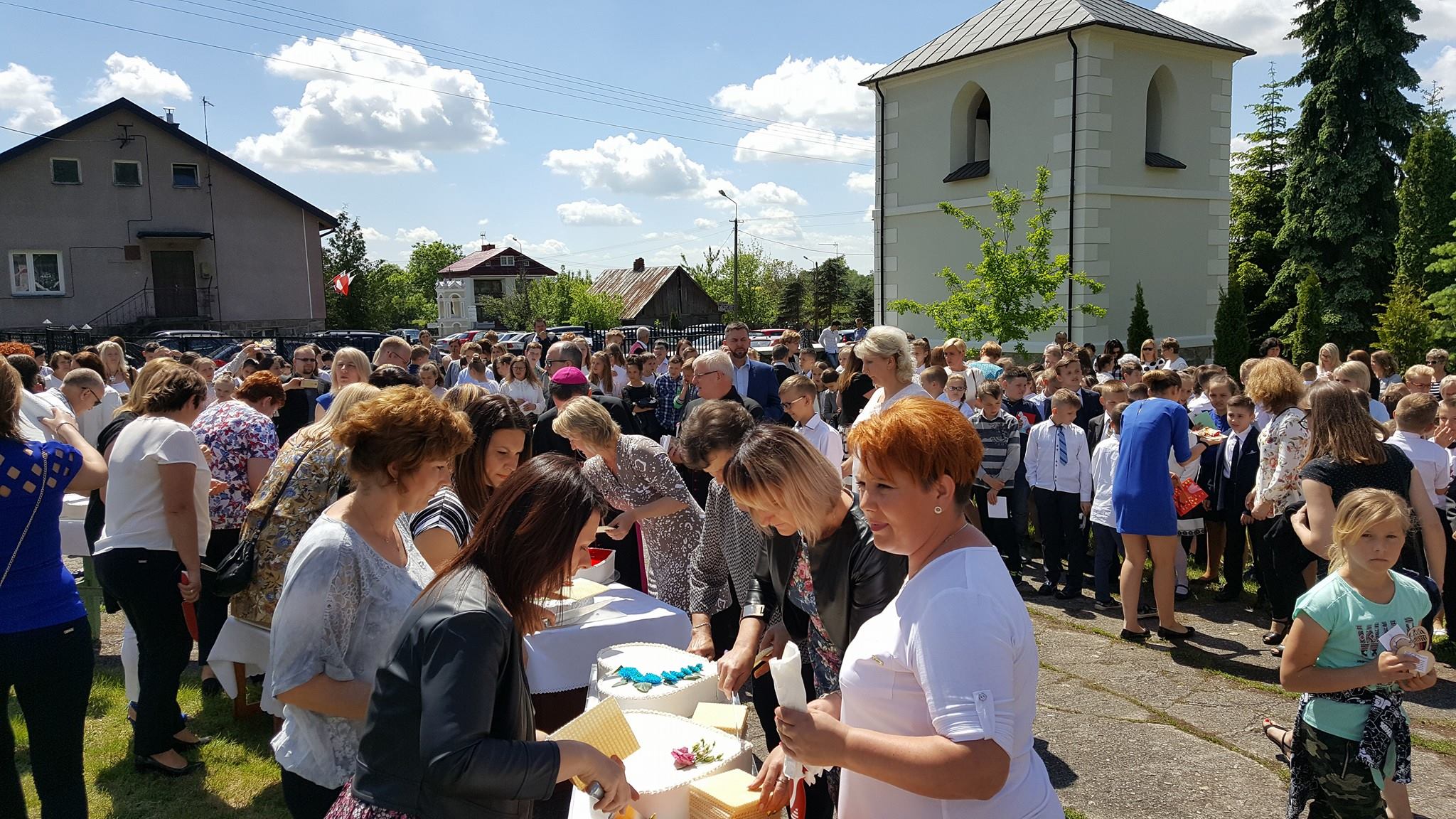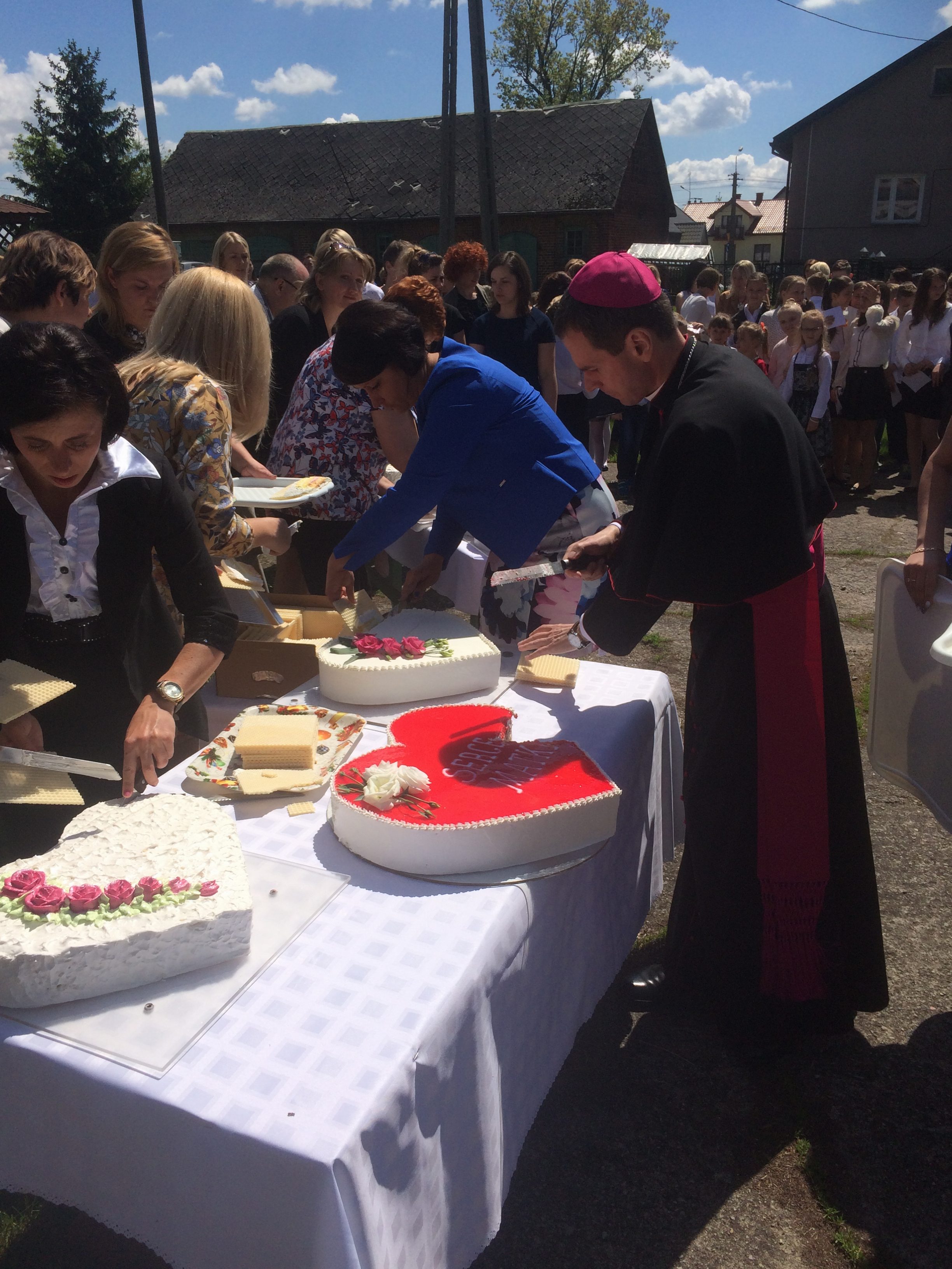 Niecodzienną atrakcją był poczęstunek wielkim, czterdziestokilogramowym tortem, upieczonym jako wyraz wdzięczności dla mam parafii, którym zostali poczęstowani wszyscy zgromadzeni. Tort dzielił Ksiądz Biskup Mirosław, błogosławiąc na koniec wszystkim na dobre przeżycie tego pięknego, słonecznego dnia.
