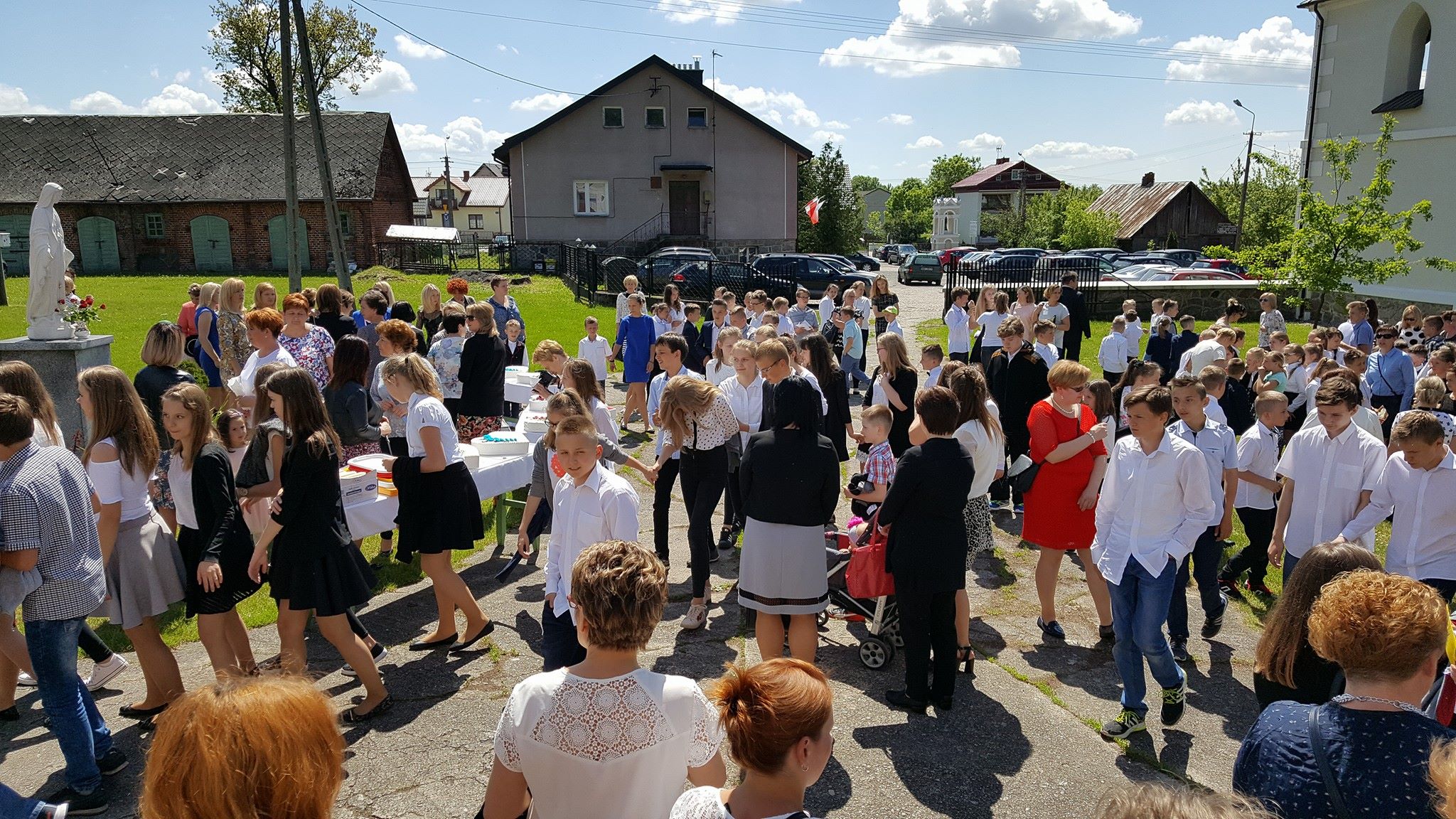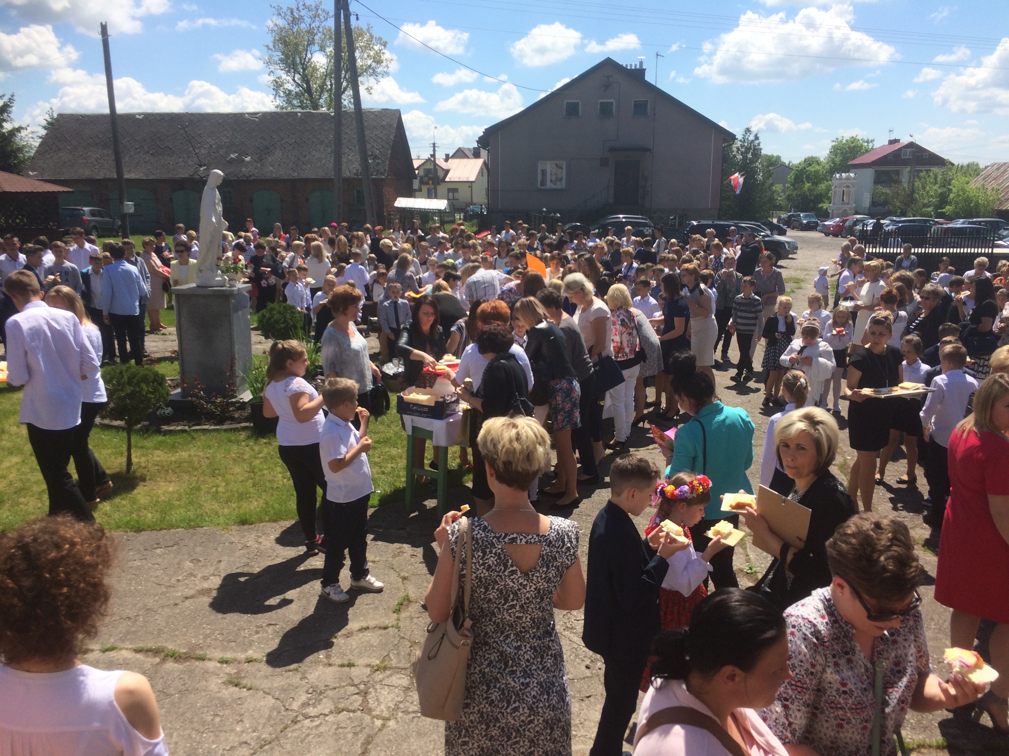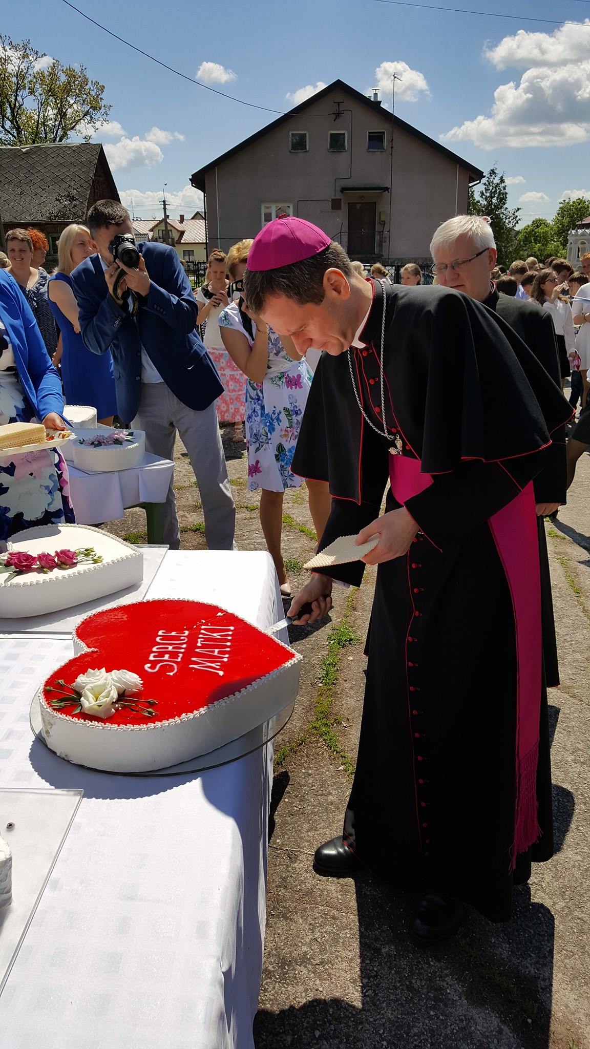 Niecodzienną atrakcją był poczęstunek wielkim, czterdziestokilogramowym tortem, upieczonym jako wyraz wdzięczności dla mam parafii, którym zostali poczęstowani wszyscy zgromadzeni. Tort dzielił Ksiądz Biskup Mirosław, błogosławiąc na koniec wszystkim na dobre przeżycie tego pięknego, słonecznego dnia.