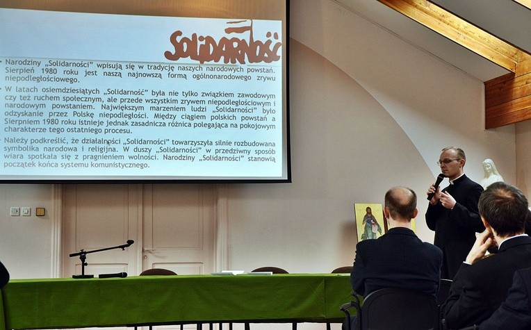 Ks. dr Wojciech Kućko swoje rozważania oparł o zasady etyki solidarności w ujęciu ks. prof. Józefa Tischnera. Mówił o narodzinach Solidarności. – Ruch ten pokazał, że na jego fundamencie można zbudować naród złożony z obywateli, którzy szanują swoją godność, wolność, którzy myślą podobnie o prawdzie i o swojej historii – stwierdzał wykładowca. – Dla ks. Tischnera, w jego filozofii, podstawowym pojęciem jest solidarność sumienia. Nasza solidarność jest przede wszystkim dla tych, których poranili inni ludzie, którzy cierpią cierpieniem możliwym do uniknięcia, przypadkowym, bądź niepotrzebnym. Solidarność jest więc spotkaniem z cierpieniem drugiego człowieka – zaznaczał ks. Kućko.