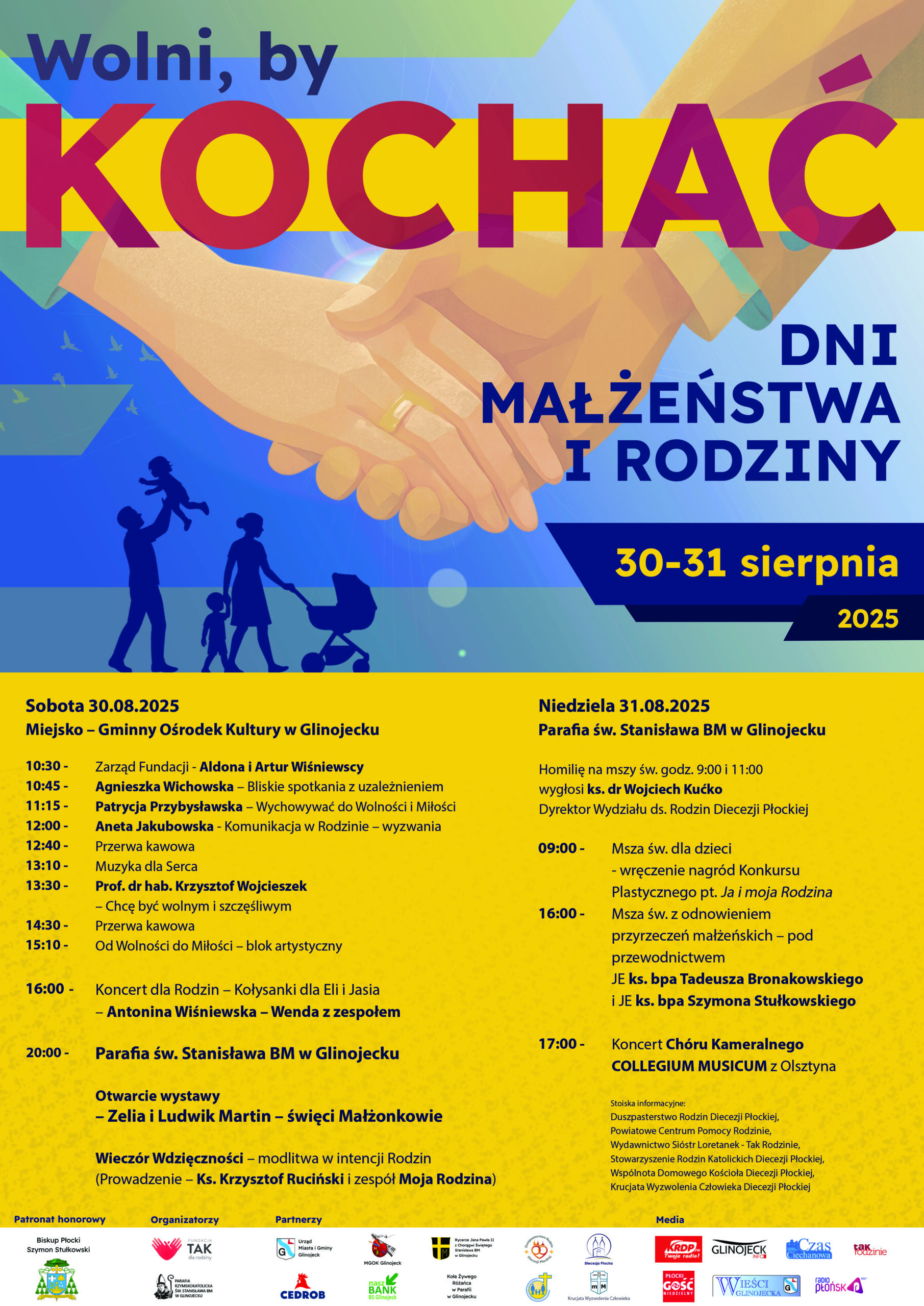 W dniach 30-31 sierpnia 2025 r., już po raz trzeci w Glinojecku, pod patronatem Biskupa Płockiego Szymona Stułkowskiego, odbędą się Dni Małżeństwa i Rodziny, których hasłem są słowa: „Wolni, by kochać”. Fundacja Tak dla Rodziny i Parafia św. Stanisława BM w Glinojecku zapraszają w sobotę, 30 sierpnia br., na ciekawe spotkania, konferencje, wykłady, wystawę, prezentacje artystyczne, a nade wszystko wspólną modlitwę za wstawiennictwem świętych małżonków – Zelii i Ludwika Martin. W niedzielę, 31 sierpnia br., podczas Mszy św. o godz. 9:00 i 11:00 czeka nas „podróż śladami życia” świętych małżonków, którą poprowadzi ks. dr Wojciech Kućko, zaś o godz. 16:00 Eucharystia z odnowieniem przyrzeczeń małżeńskich, której będzie przewodniczył Biskup Pomocniczy Diecezji Łomżyńskiej Tadeusz Bronakowski. Będzie się z nami modlił także Biskup Płocki Szymon Stułkowski.